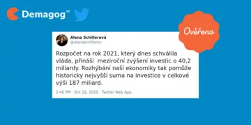 „Rozpočet na rok 2021, který dnes schválila vláda, přináší meziroční zvýšení investic o 40,2 miliardy. Rozhýbání naší ekonomiky tak pomůže historicky nejvyšší suma na investice v celkové výši 187 miliard.“