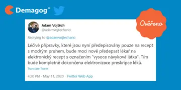 „Léčivé přípravky, které jsou nyní předepisovány pouze na recept s modrým pruhem, bude moci nově předepsat lékař na elektronický recept s označením „vysoce návyková látka“. Tím bude kompletně dokončena elektronizace preskripce léků.“