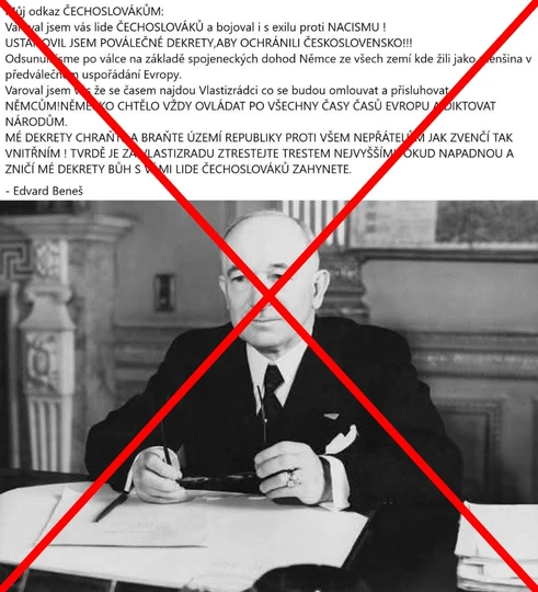 Příspěvek obsahuje údajné vyjádření někdejšího československého prezidenta Edvarda Beneše nadepsané: „Můj odkaz Čechoslovákům“. Text zmiňuje Benešův boj proti nacismu z exilu či poválečný odsun Němců a připomíná válečné a poválečné dekrety, dnes známé především jako Benešovy dekrety. „Varoval jsem vás, že se časem najdou vlastizrádci, co se budou omlouvat a přisluhovat Němcům! Německo chtělo vždy ovládat (…) Evropu,“ řekl podle textu Beneš. Citace končí dalším varováním: „Mé dekrety chraňte a braňte území republiky proti všem nepřátelům, jak zvenčí, tak vnitřním! (…) Pokud napadnou a zničí mé dekrety, Bůh s vámi, lide Čechoslováků, zahynete.“