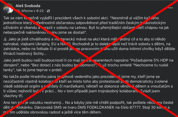 Příspěvek sdílí údajný citát prezidenta Petra Pavla, který se měl vyjádřit ke shromáždění na Letné pořádaném spolkem Milion chvilek v sobotu 21. března. Prezident podle příspěvku uvedl, že si „nesmírně váží“ každého, kdo „upřednostnil občanskou odpovědnost před tradičním českým hédonistickým užíváním si víkendu“. Podle textu Pavel tyto občany označil za „přemýšlející“ občany, kteří chápou, na jak „nebezpečně nakloněnou rovinu“ se společnost dostala.