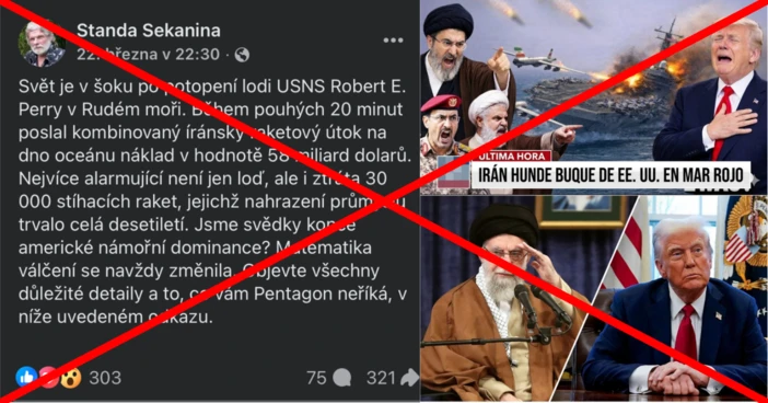 Neexistuje žádný důkaz o tom, že by loď USNS Robert E. Peary (v příspěvku chybně uvedená jako Perry) byla potopena v Rudém moři. Konkrétní čísla o hodnotě nákladu jsou smyšlená a pocházejí z videí vytvořených pomocí umělé inteligence. Reálné záznamy o pohybu plavidel potvrzují, že se loď v době údajného útoku nacházela v Karibiku, nikoliv v Rudém moři. Facebookový příspěvek tvrdící, že americké námořnictvo přišlo o loď a náklad za 58 miliard dolarů, jsme proto v rámci naší spolupráce s Facebookem označili jako nepravdivý.