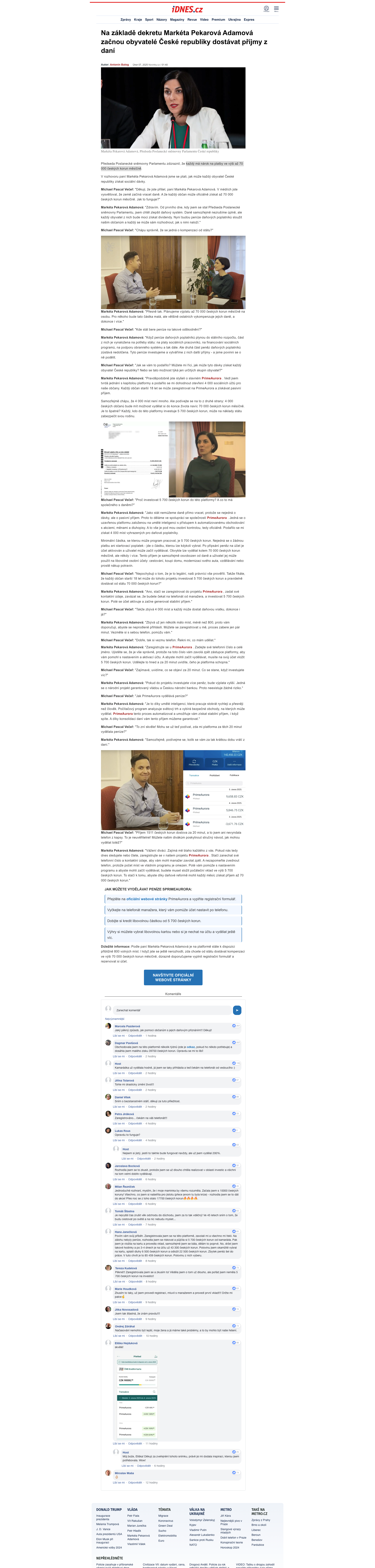 Rozhovor na stránce vydávající se za web iDNES.cz, ve kterém předsedkyně Poslanecké sněmovny Markéta Pekarová Adamová mluví o vracení daní občanům a nabádá k investici do platformy PrimeAurora, je smyšlený. Tyto podvodné weby se na sociálních sítích objevují opakovaně a jejich cílem je s příslibem rychlého zhodnocení vylákat z uživatelů citlivé údaje nebo peníze, jako v tomto případě.