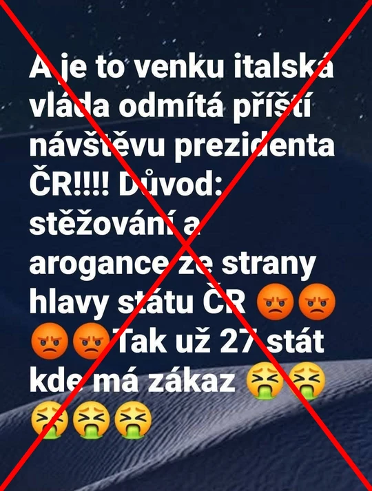 Podle textu facebookových příspěvků odmítá italská vláda příští návštěvu českého prezidenta. Důvodem pro nepřijetí má být jeho „stěžování a arogance“. Údajně se jedná již o 27. stát, ve kterém má prezident Pavel „zákaz“.