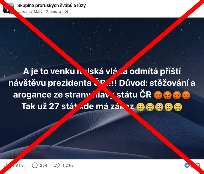 Tvrzení o italském odmítnutí příští návštěvy prezidenta Petra Pavla jsme hledali na oficiálních stránkách Pražského hradu i italské vlády. Žádné informace o zrušené návštěvě či diplomatickém zákazu však ve veřejně dostupných zdrojích nejsou dohledatelné. Naopak, jak dokládá účast prezidenta Petra Pavla na Zimních olympijských hrách v únoru 2026 i oficiální návštěva italského prezidenta Sergia Mattarelly v Praze v dubnu téhož roku, vzájemný kontakt a plánovaná setkání mezi Petrem Pavlem a nejvyššími italskými činiteli nadále probíhají. Zmínka o 27 státech, do kterých má údajně Petr Pavel zákaz vstupu, je zcela smyšlený a nezakládá se na žádném oficiálním rozhodnutí zahraničních zemí. V rámci naší spolupráce se společností Meta jsme proto tento příspěvek označili jako nepravdivý.