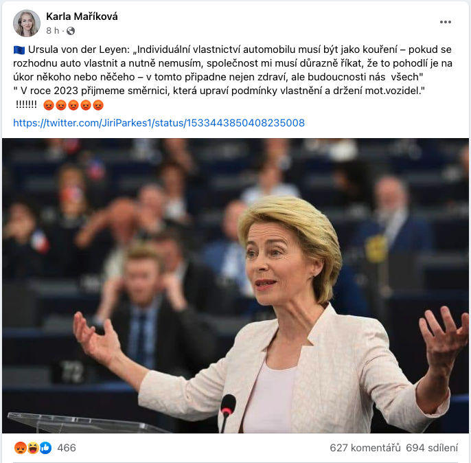 „Individuální vlastnictví automobilu musí být jako kouření – pokud se rozhodnu auto vlastnit a nutně nemusím, společnost mi musí důrazně říkat, že to pohodlí je na úkor někoho nebo něčeho – v tomto připadne nejen zdraví, ale budoucnosti nás všech. V roce 2023 přijmeme směrnici, která upraví podmínky vlastnění a držení mot. vozidel,“ píše se v jedné z verzí virálního příspěvku.