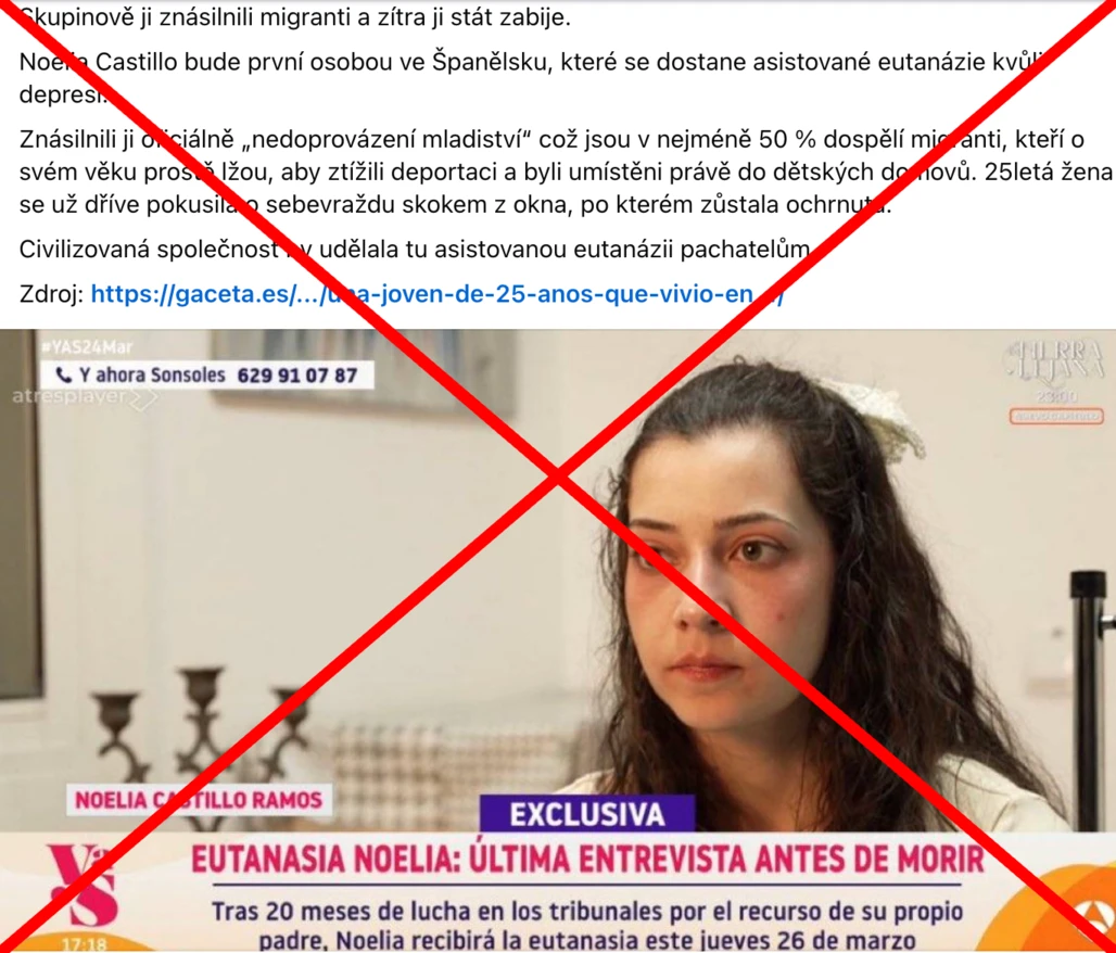 Podle příspěvku podstoupila Španělka Noelia Castillo eutanazii kvůli depresi poté, co byla znásilněna migranty. Ze soudního rozhodnutí však vyplývá, že hlavním důvodem k eutanazii byla kombinace neléčitelných fyzických a psychických útrap, zejména ochrnutí dolních končetin. Noelia Castillo skutečně uvedla, že byla obětí znásilnění, její výpověď ani informace od španělských úřadů však neuvádějí, že by pachatelé byli migranti nebo „nedoprovázení mladiství“. Příspěvek jsme proto v rámci spolupráce s Facebookem označili jako nepravdivý.
