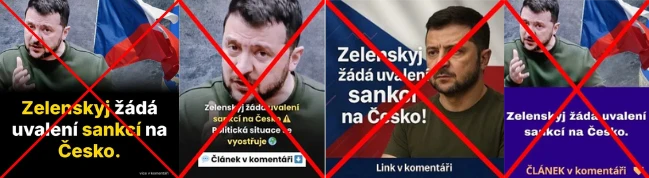 Tyto facebookové příspěvky zpravidla obsahují fotku ukrajinského prezidenta Zelenského a titulek „Volodymyr Zelenskyj žádá o uvalení sankcí na Česko“. Některé z nich navíc odkazují na článek webu fasteer.cz, zatímco jiné na článek webu netzpravy.cz. Text obou článků je ale totožný a pravděpodobně vznikl v červnu 2025, kdy vyšel první z těchto článků.