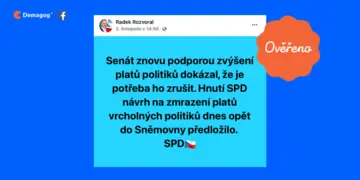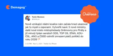 „Vytvořili (vznikající vládní koalice, pozn. Demagog.cz) navíc 3 nové ministry, další nové místo místopředsedy Sněmovny pro Piráty a již minulý týden senátoři ODS, TOP 09, STAN, KDU-ČSL, ANO a ČSSD odmítli zmrazení platů politiků do roku 2026👎🏻“